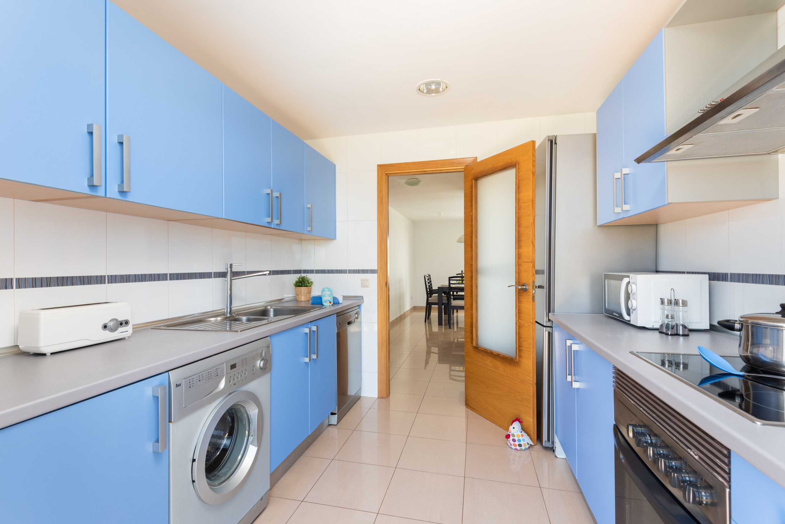 La cuisine est indépendante avec une plaque vitrocéramique, elle est équipée d'un réfrigérateur, d'un micro-ondes, d'un four, d'un congélateur, d'un lave-vaisselle, de vaisselle/couverts, d'ustensiles de cuisine, d'une cafetière, d'un grille-pain, d'une bouilloire et d'un presse-agrumes.